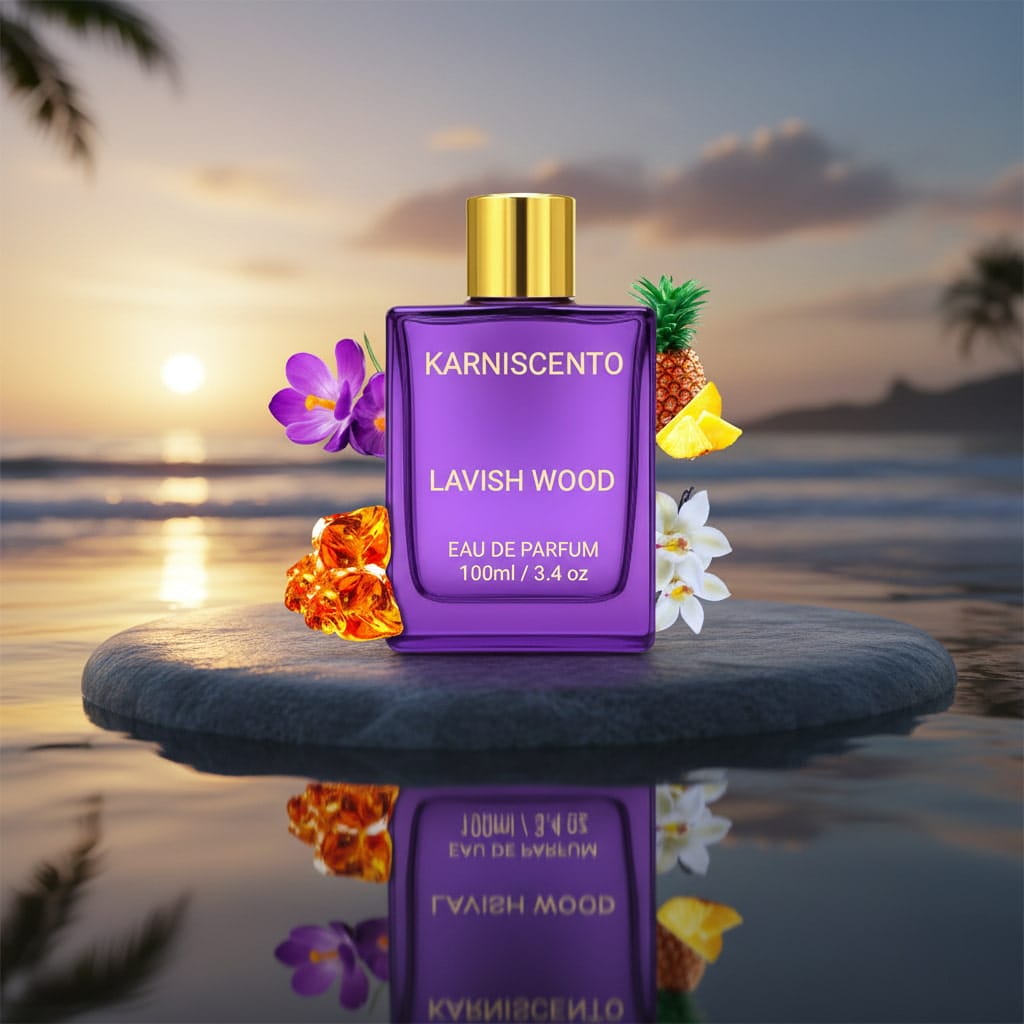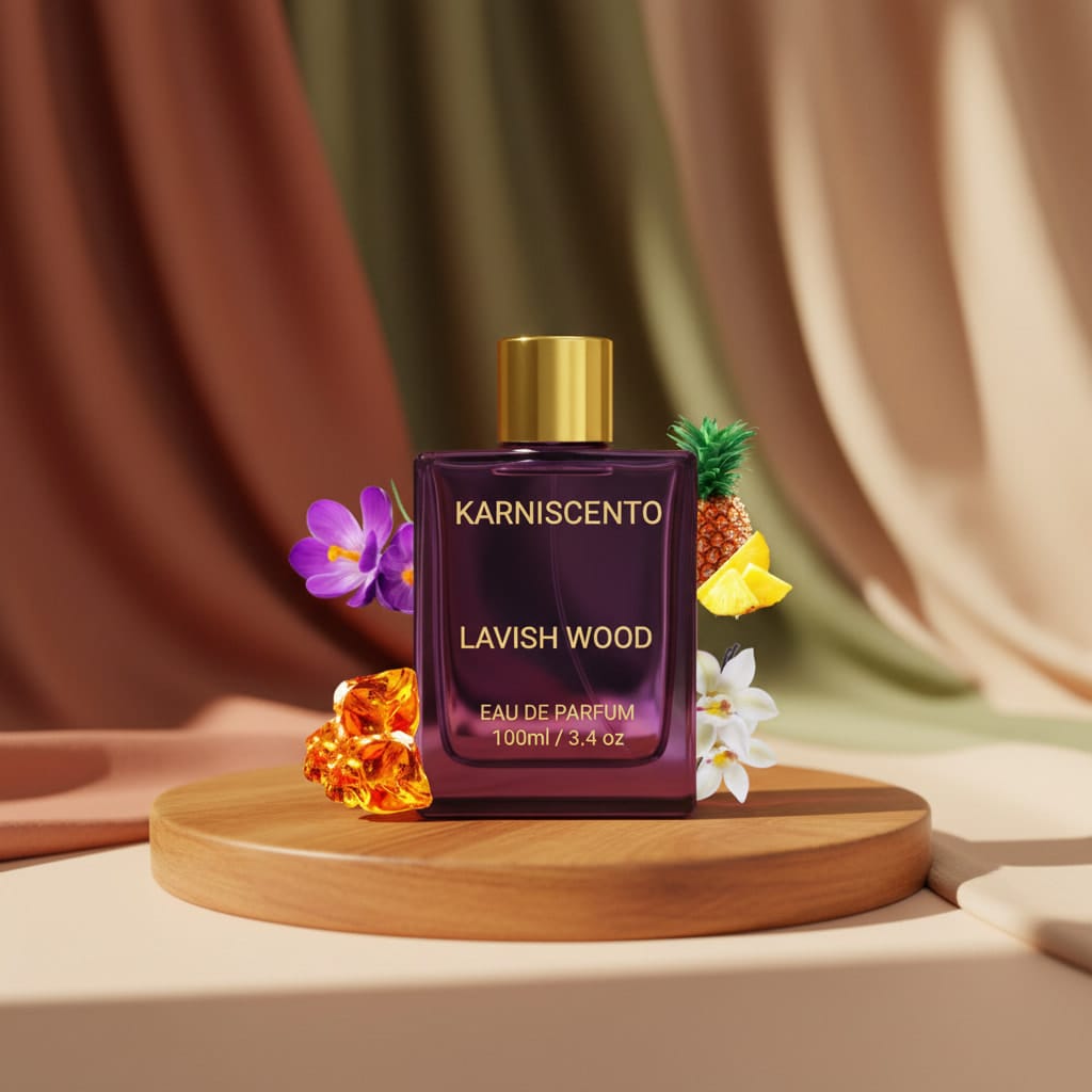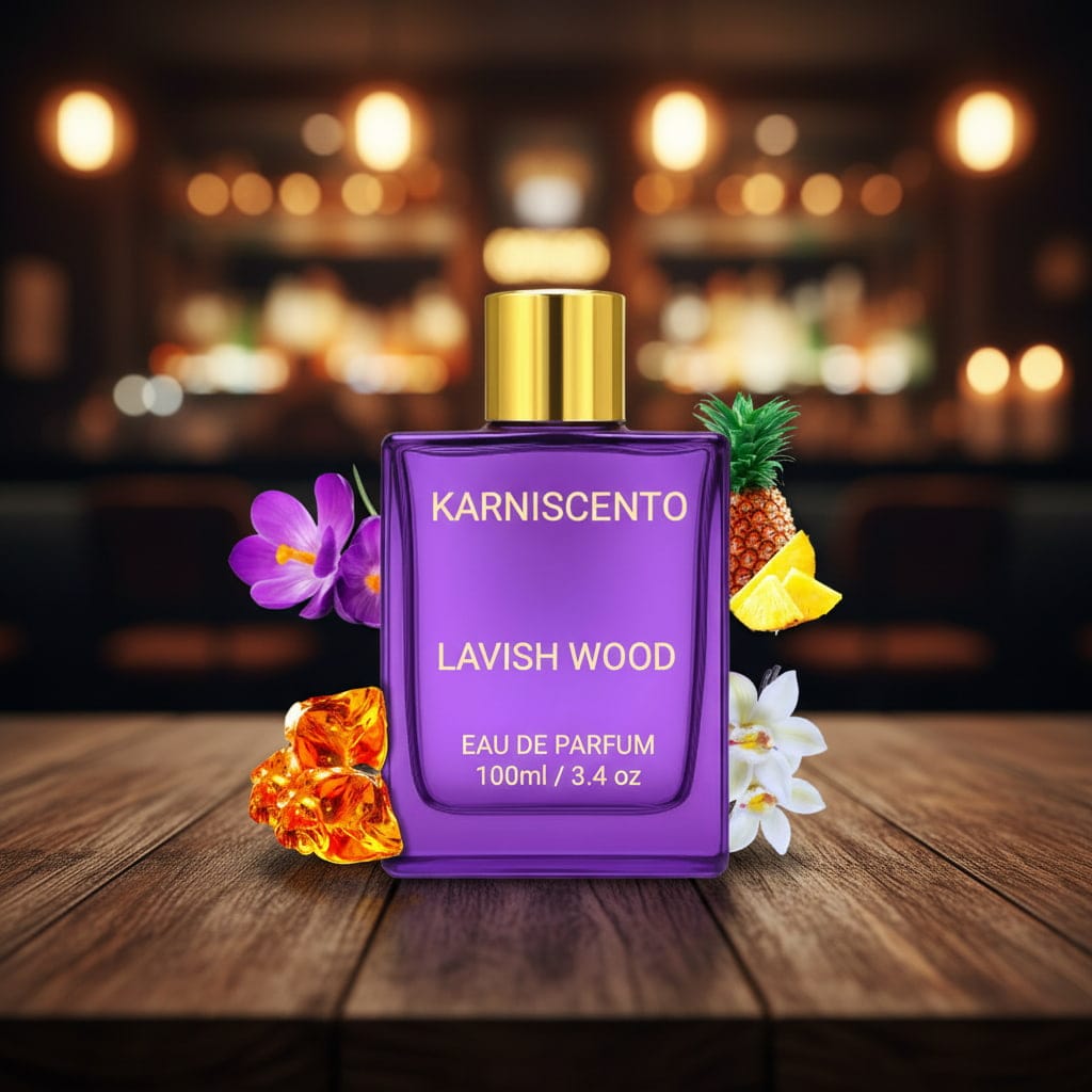 Karniscento Lavish Wood | A vibrant, woody-floral scent capturing the dual spirit of energy & elegance | Bright notes of pineapple & bergamot | Heart of jasmine, rose & white florals | Luxurious base of patchouli, vanilla, amber & musk | Leaves a sophisticated and lasting impression.
